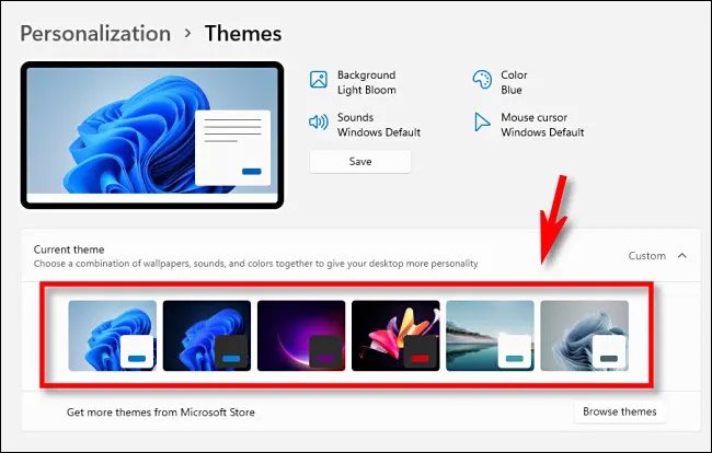 در ویندوز ۱۱ چندین تصویر پسزمینهی جذاب برای تمهای مختلف وجود دارد که جذابیت این سیستمعامل را دوچندان میکنند. از طریق Settings > Personalization > Themes میتوانید تمهای موردنظر خود را انتخاب کنید و در کنار آن قادر به انتخاب حالت تاریک و روشن هم هستید. زمانی هم که از دست تمهای پیشفرض ویندوز ۱۱ خسته شدید، از طریق مایکروسافت استور میتوانید تمهای رایگان یا پولی نصب کنید.